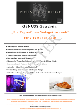 Sie haben einen Gutschein für ein Event auf dem Bio Weingut Neuspergerhof erhalten und möchten diesen nun einlösen? Sie können die Einlösung Ihres Gutscheins in wenigen Schritten Online vornehmen.